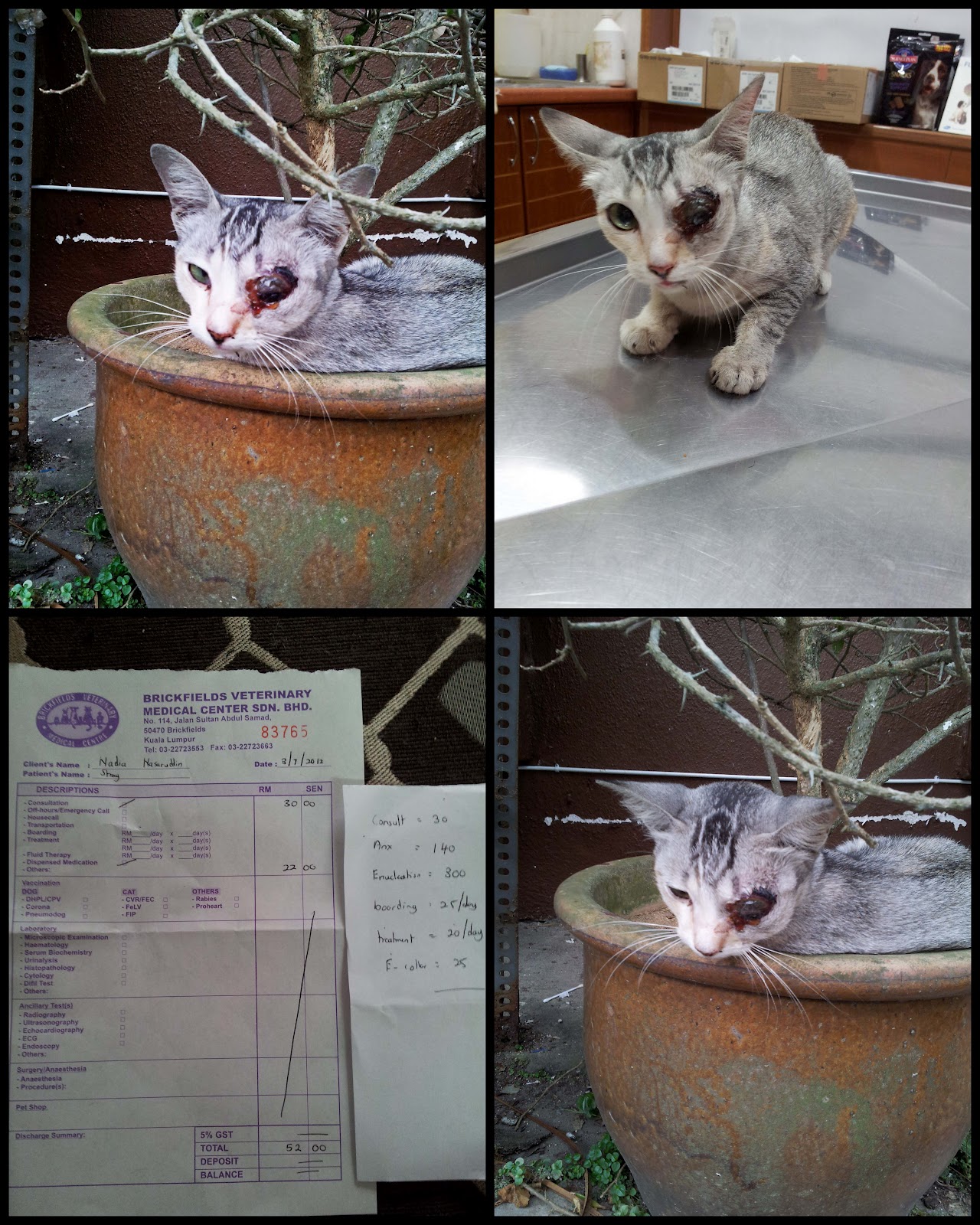 I'm requesting for help for this poor kitty. I've been regularly feeding the stray cats in my area so this kitty is one of the stray cats, I think she been hit by a car or motorcycle due eye injury. Yesterday (3/7/2012) i finally able to catch her and bring her to vet at Gasing Veterinary Hospital.